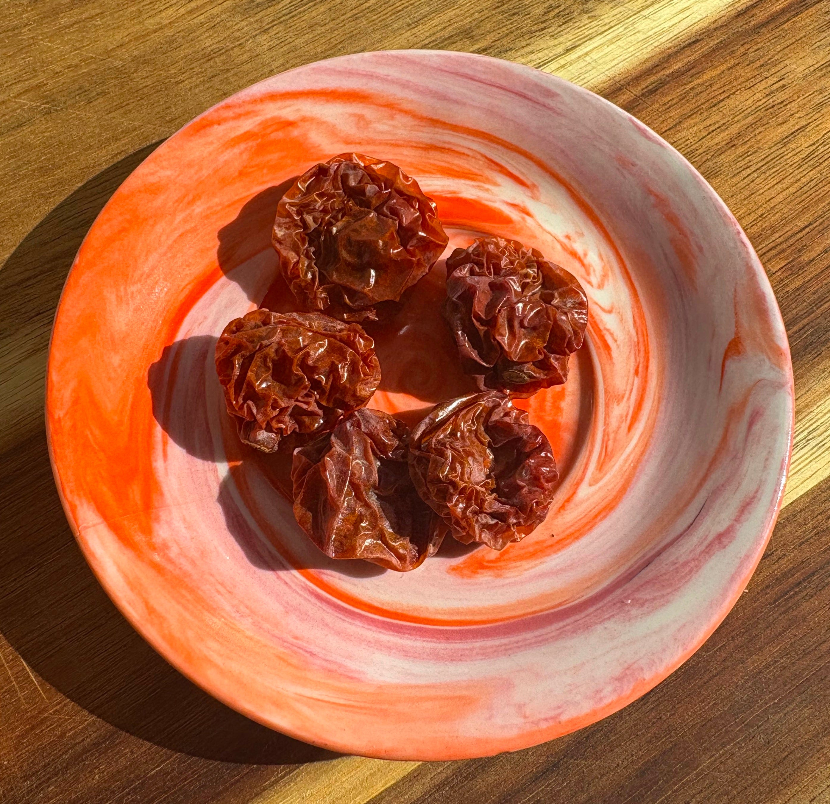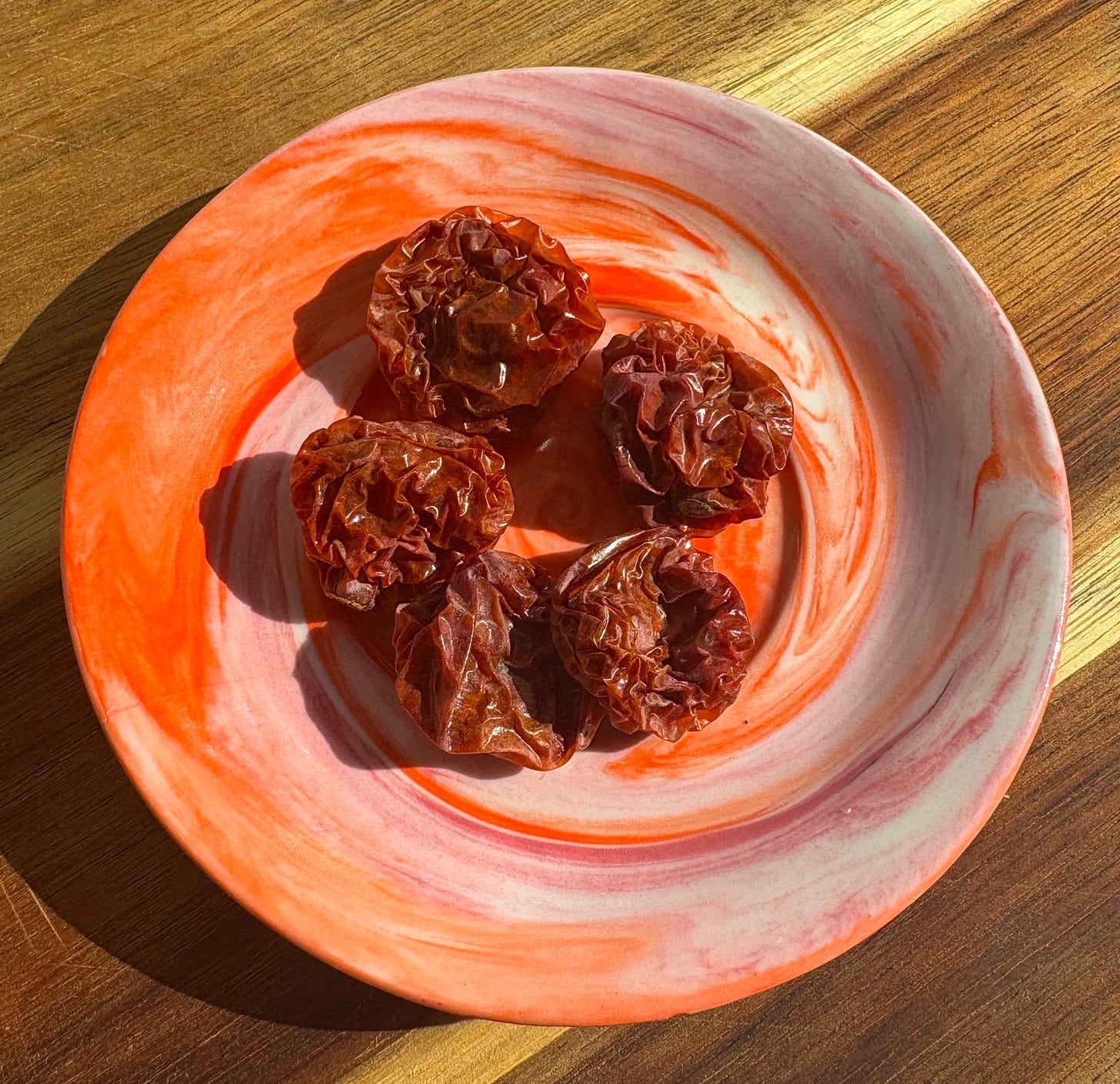 By placing foods into a dehydrator or low oven (between 120ºF-200ºF) anywhere from one hour to twenty four hours, you will find foods that have a very concentrated interior while the exterior can become chewy, like a fruit leather. This application on tomatoes yields something similar to sun dried tomatoes.